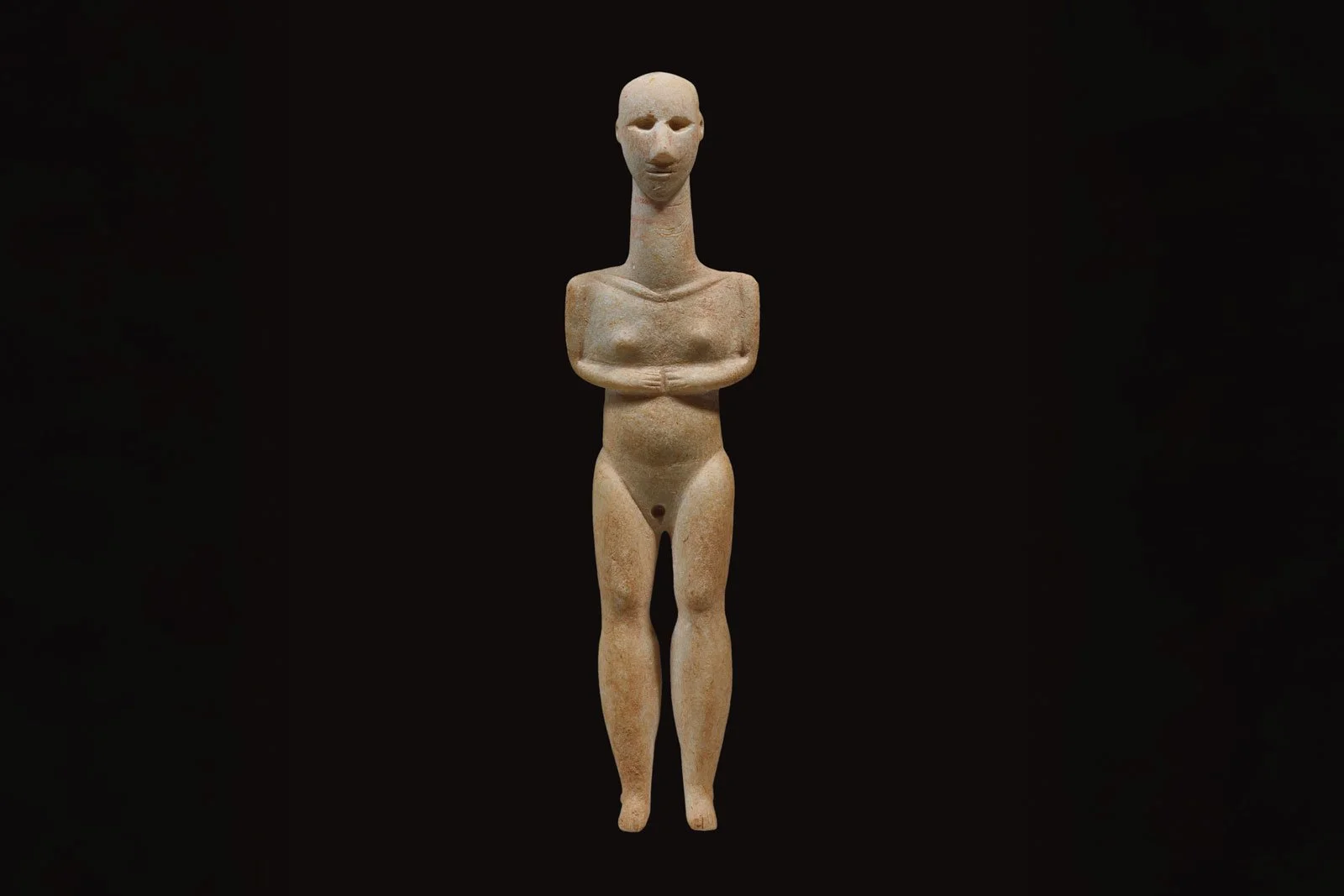 A classic Cycladic marble figurine, defined by folded arms, abstracted anatomy, and clean geometric lines that shaped early Aegean visual language.