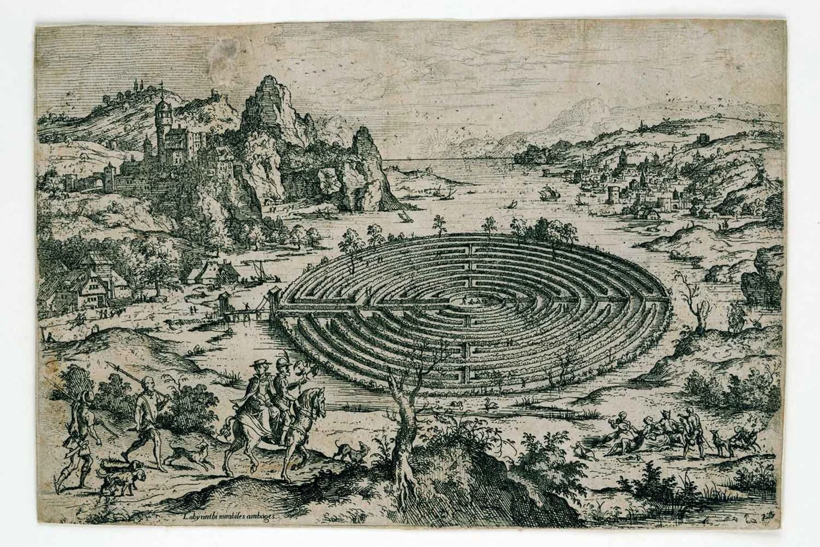This detailed view of a circular labyrinth shows how early modern artists imagined the Cretan maze as a walkable garden woven into a real landscape.