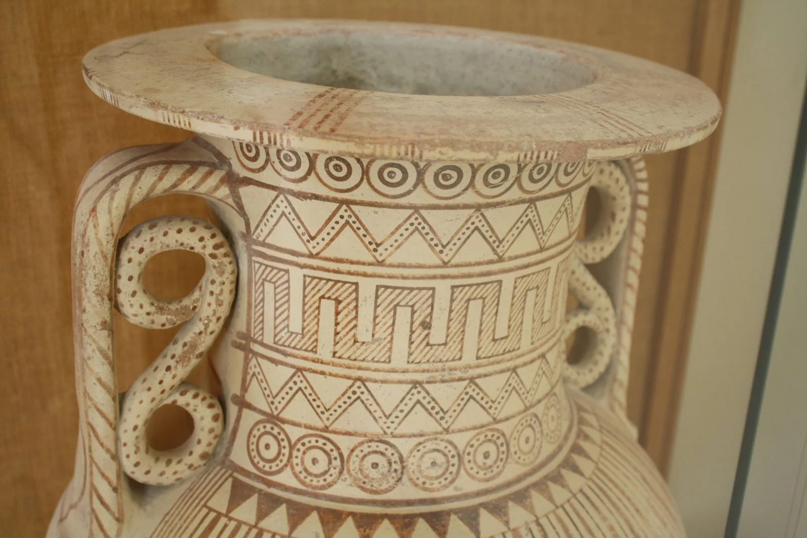 The name “geometric” comes straight from the look. Surfaces are organized into registers, horizontal bands that wrap around the vessel. Inside those bands we find meanders, triangles, squares, concentric circles and cross-hatching, all drawn with compass and straightedge tools. The effect is almost like a textile pattern translated into paint and clay.